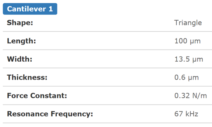 All cantilevers are stress compensated and have a 35 nm chromium / gold coating on the detector side ensuring good reflectivity.